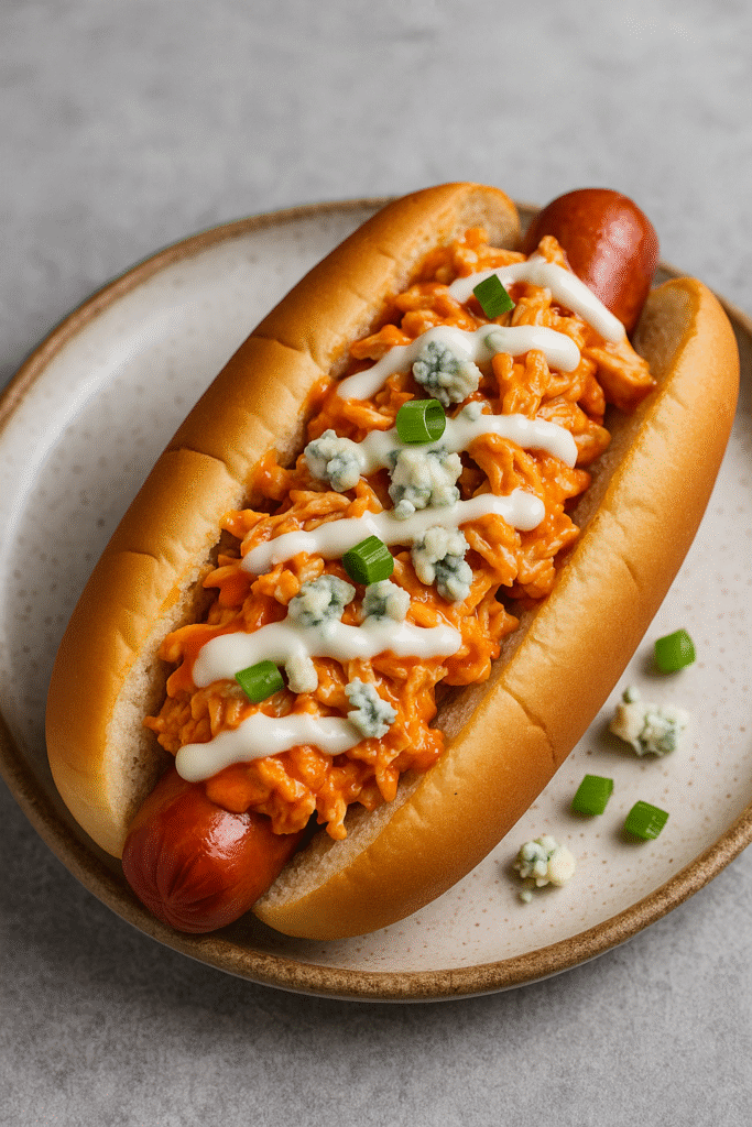 This Buffalo Chicken Hot Dog is a fun twist on a classic favorite. Topped with spicy chicken, creamy ranch, and fresh green onions, it packs a punch of flavor. Perfect for your 4th of July BBQ, this dish will have everyone coming back for seconds!