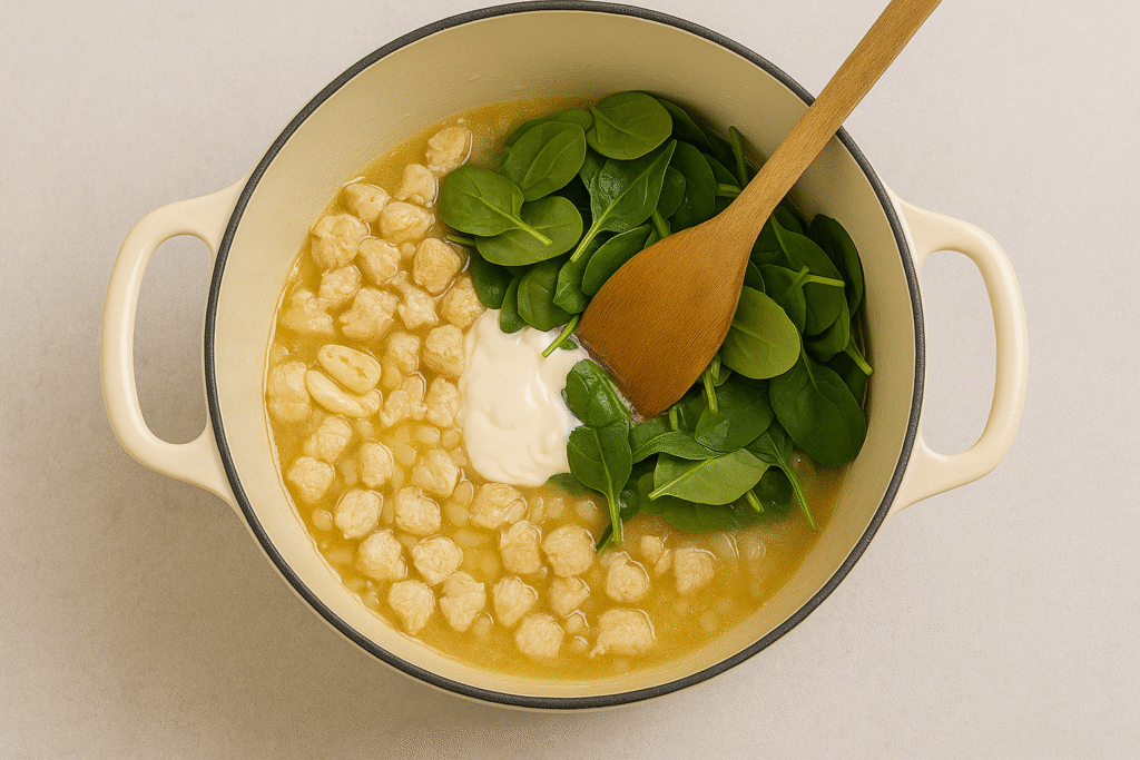 Reduce heat. Stir in heavy cream, spinach, and Italian seasoning. Simmer for 5 minutes.